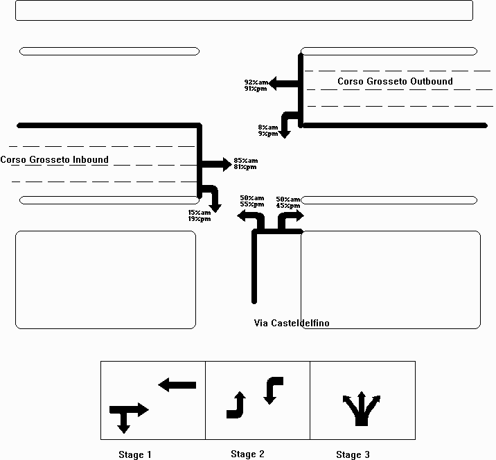 Again because of the higher cycle times, queues on the side roads increase slightly, but not greater than 3 vehicles in absolute terms. A strong reduction in queues in the outbound direction of Corso Grosseto is noted, probably due to better management of the left turning traffic on Via Ala di Stura Sud. Changes in the coordination of the intersections, as for junction 11, result in the benefits of the AM becoming disbenefits in PM. Unlike junction 11 the changes in the average queues are not reflected in the journey times on the link.